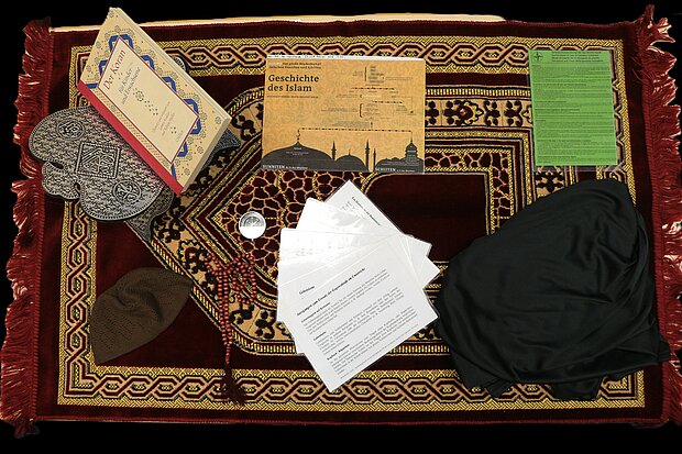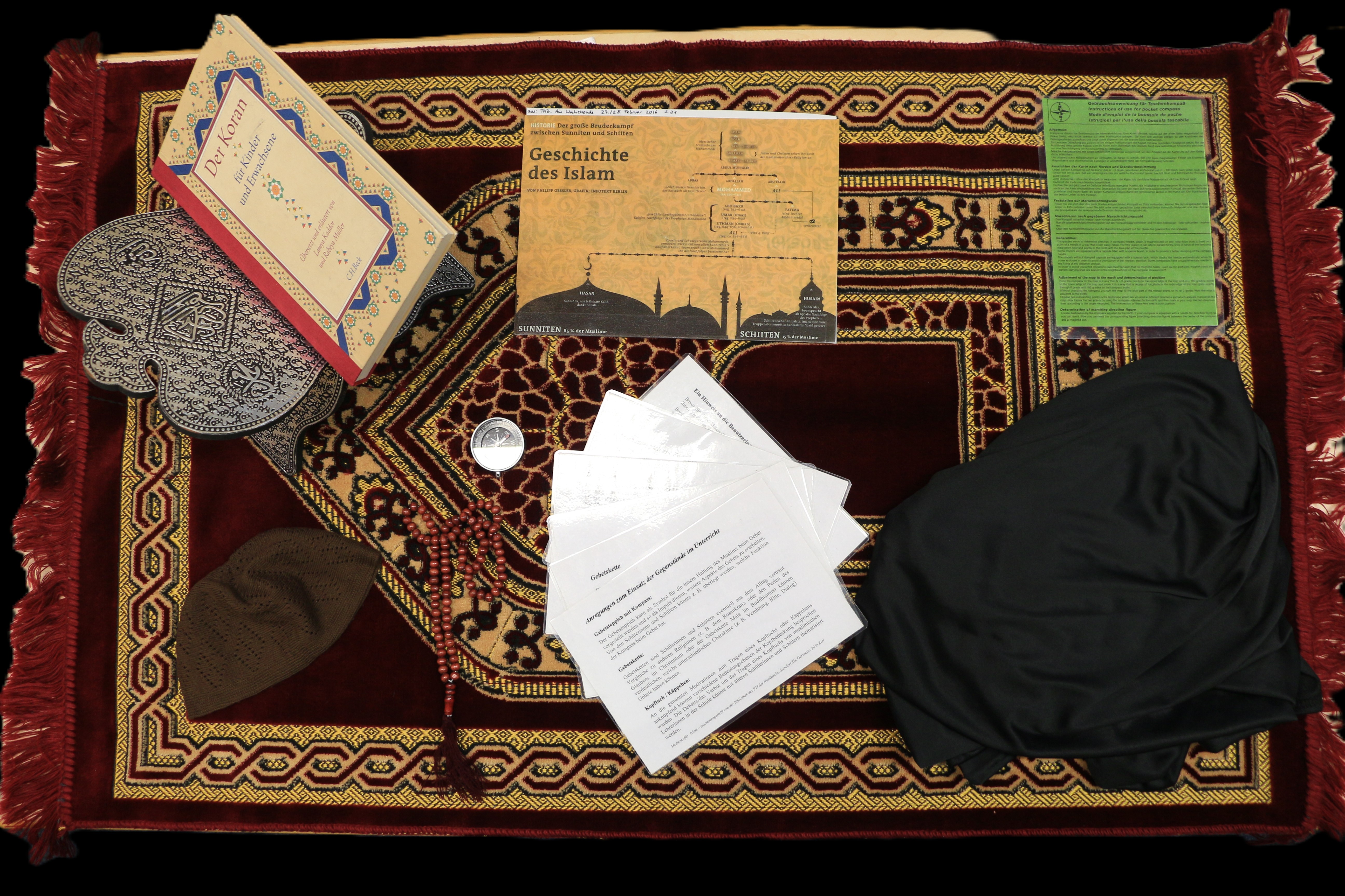 Der Koffer ist geeignet für alle Schulstufen. Er enthält: 1 Gebetsteppich, 1 Kopftuch, 1 Kompass, 1 Kopfbedeckung für Männer, 1 Gebetskette, 1 Zahnpasta, 1 alkoholfreien Duft, 1 Kaaba-Abb., 1 Koran, 1 Pappe Ramadan-Fäden, 1 verzierte Sure, 1 TBC: Der Ruf des Muezzin, 1 Moschee-Abbildung, Buch und CD: Meyer, Karlo: Lea fragt Kazim nach Gott (Vandenhoeck & Ruprecht, 2006), Erläuterungen zu den Gegenständen.