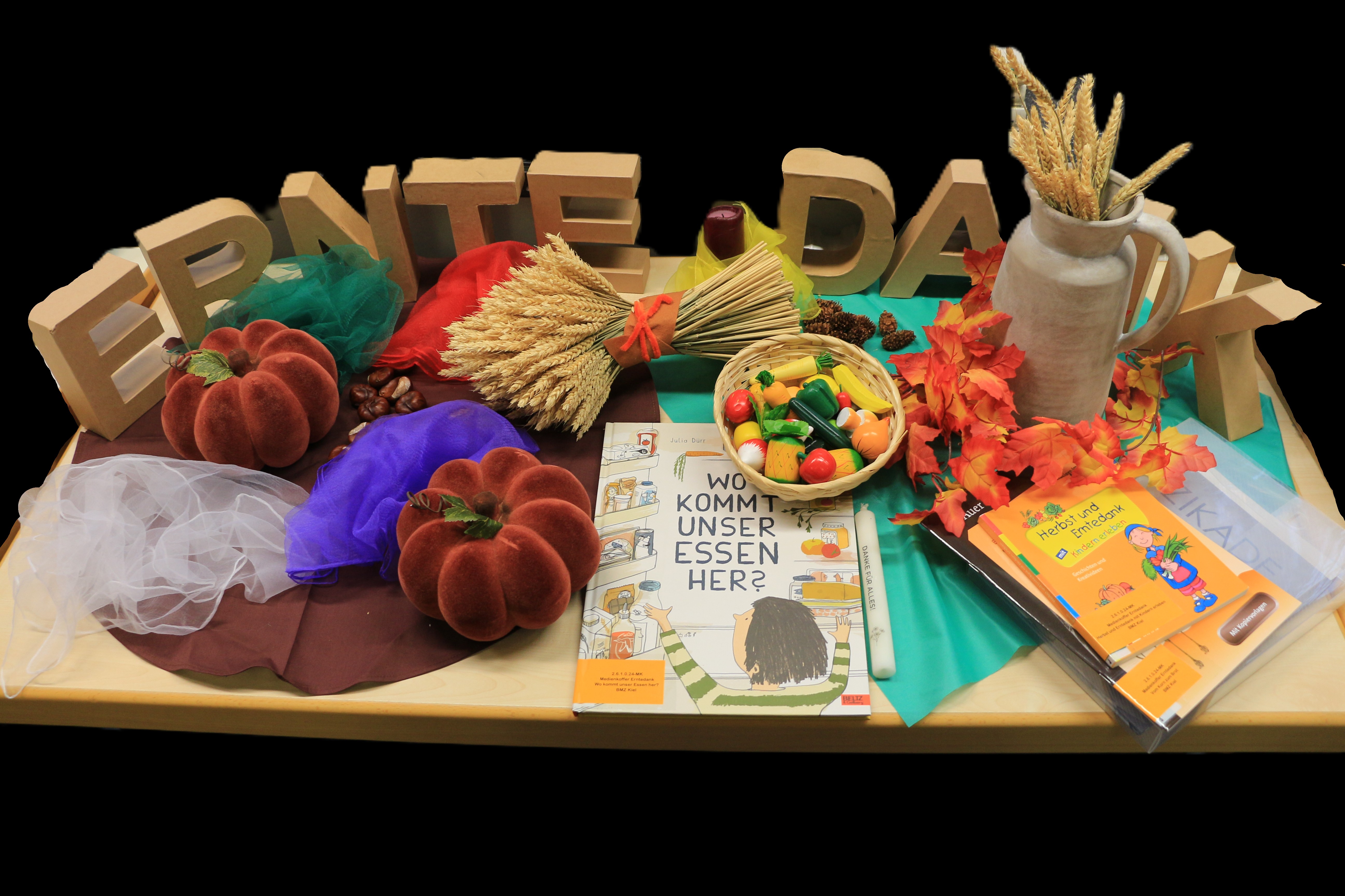 Dieser Koffer ist geeignet für die Primar- und Elementarstufen. Dieser enthält: Unterrichtsmaterial „Vom Korn zum Brot“, Unterrichtsmaterial „Herbst und Erntedank mit Kindern erleben“, Bilderbuch „Wo kommt unser Essen her“, 1 Tonkrug, Korb mit Holzobst und -gemüse (21 Teile), 2 beflockte Kürbisse , Kerze „Danke für Alles“, Kerze auf Holzscheibe, 9 Papp-Buchstaben (E;R;N;T;E;D;A;N;K), braunes Rundtuch, 5 Gazetücher (rot, lila, grün, gelb und weiß), ca. 20 lose Ähren, Blättergirlande, ca. 20 Kastanien, ca. 20 Tannenzapfen, Ähren im Bund.