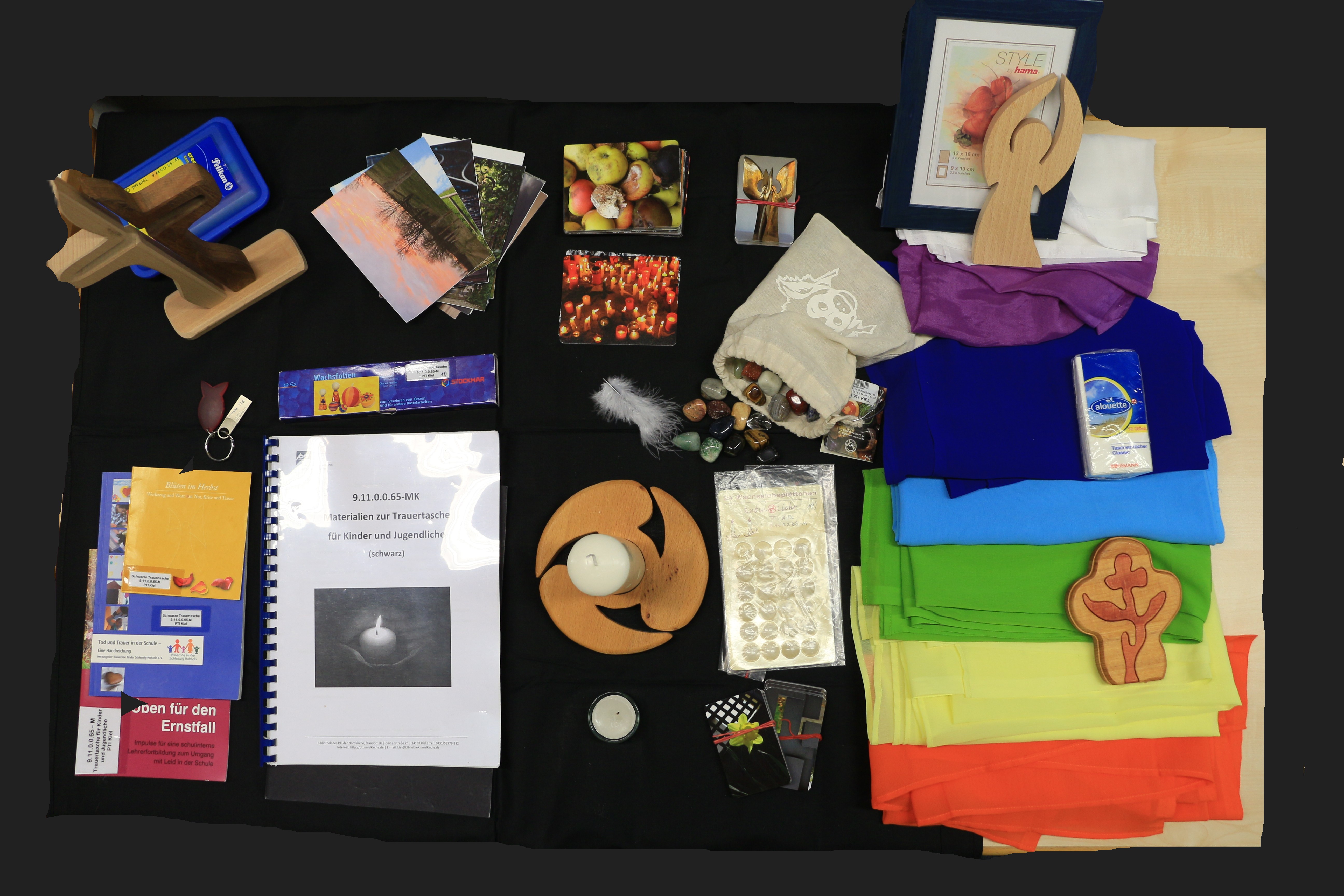 1 Kondolenzbuch zum Selbstgestalten, 3 Bilderrahmen aus Kunststoff, 1 Meditationskreuz aus hellem/dunklem Holz, 1 Kerze mit farbigen Wachsblättchen zum Gestalten, 45 Gebetskärtchen mit drei Motiven, 40 Symbolbildkarten mit 20 Motiven, 5 Symbolbildkarten für kleinere Kinder (DIN A4), 1 Kuschelbär und 1 Plüschhund als Trostspender, Holzstern (12 Teile) mit 12 Teelichtern, 1 violettes Baumwolltuch, 6 Nylon-Tücher (rot, blau, grün, violett, orange, gelb), Flauschfedern, Glasnuggets, Filzlegeteile, 1 Mappe mit Gebeten und Texten, 1 Handreichung „Tod und Trauer in der Schule“, 1 USB-Stick mit Texten, 1 Päckchen Taschentücher
